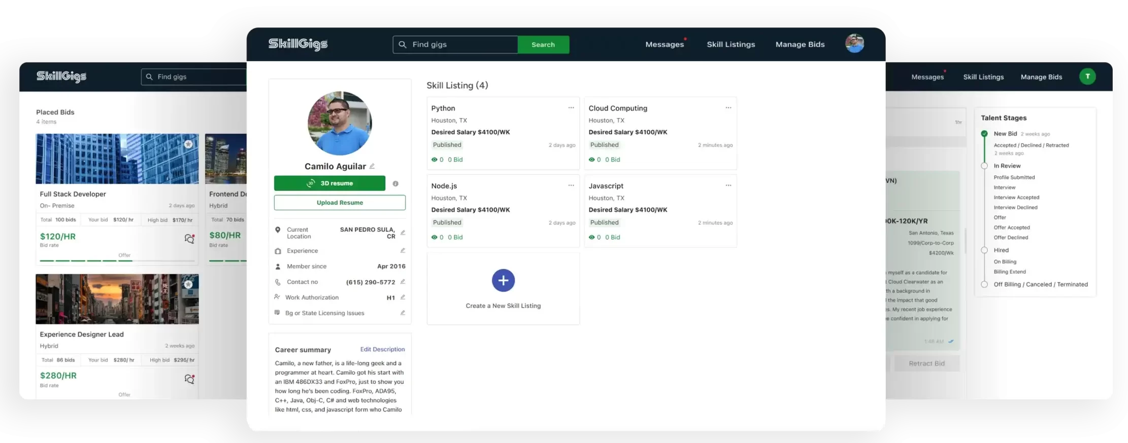 SkillGigs provides talented professionals the ability to show interest, by way of a bid, directly to employers. It’s a change from the traditional way of applying. Job boards will fail you or give you false hope. Although we are a tech marketplace, we also are full service insuring that all talent is based by a customer service rep who will help keep track of your activity.