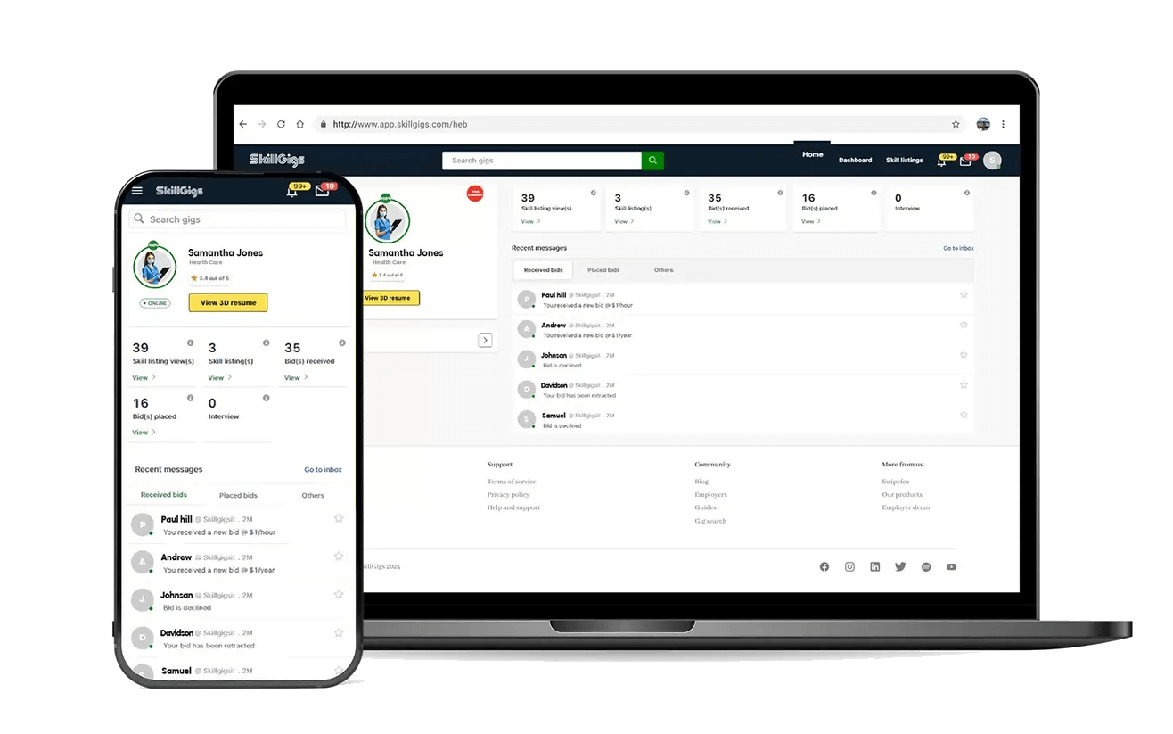 Say goodbye to the endless chase, the futile recruiter calls that lead nowhere but to frustration. SkillGigs brings opportunities directly to your doorstep, transforming the way you engage with the job market. Our talent bidding system is a conduit to swift, decisive action, placing you on assignments with a speed that traditional recruitment can’t match.