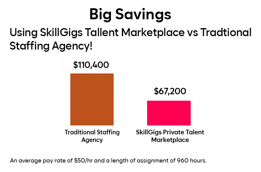 Your contract workforce is more than just personnel—it’s your human capital. Instead of channeling valuable resources to staffing agencies, consider SkillGigs for a sustainable approach. We understand the financial strain of each time you rehire a contractor previously sourced from a staffing vendor. We’ve got the solution you need- your very own Private Talent Marketplace. A new transparent, more efficient custom-tailored approach which not only meets your requirements but also slashes costs by an average of 50% compared to traditional VMS supplier led model. Imagine your entire contractor workforce converted into a community inside a private marketplace, you’re all in one source for talent supply. Let us optimize your workforce strategy and unlock significant savings together.
